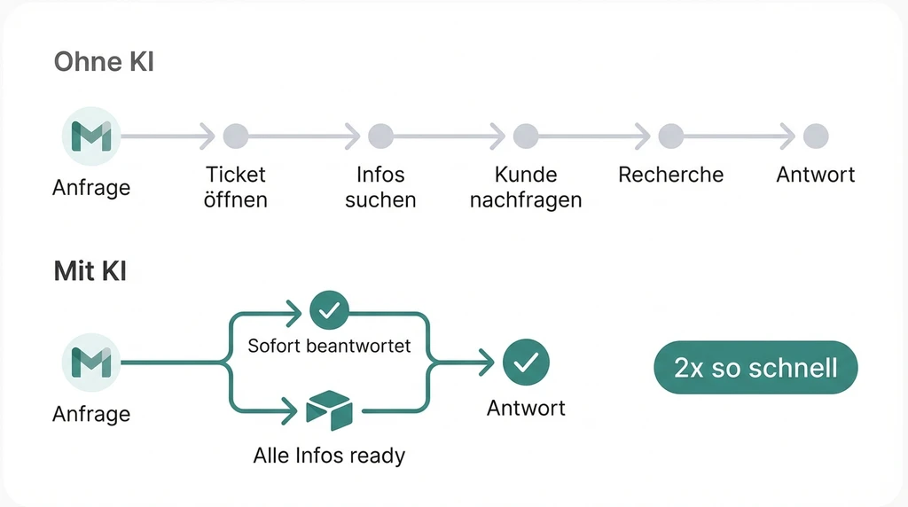 Standard-Anfragen beantwortet der Agent. E-Mail, WhatsApp, Chat – bevor ein Mensch draufschaut. Wenn dein Team doch ranmuss, haben sie alle Infos parat. Kein Suchen. Kein Nachfragen. Dein Kunde denkt, du hast 10 Leute im Support.