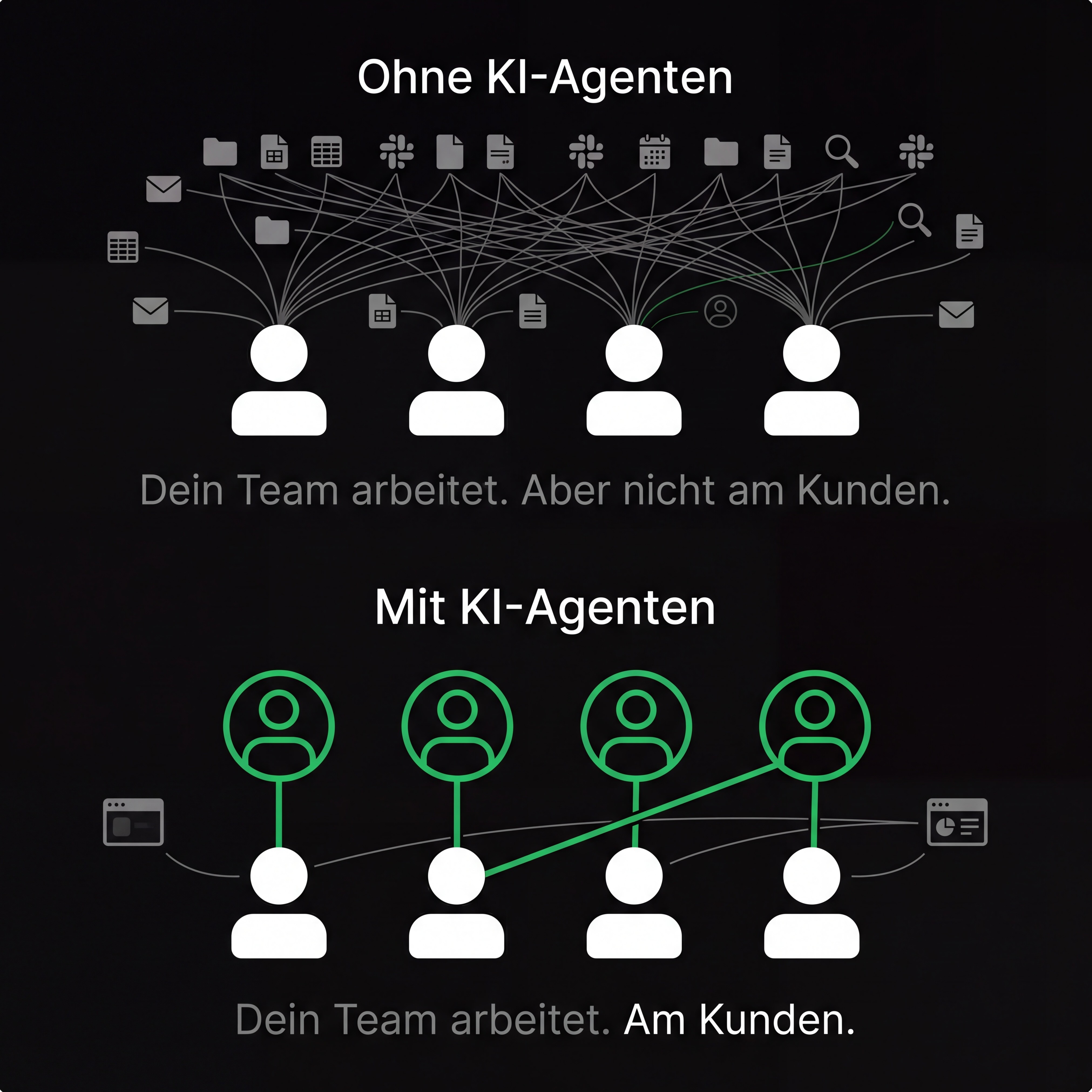 KI-Agenten ersetzen keine Mitarbeiter. Sie nehmen deinem Team genau die Aufgaben ab, die es jeden Tag ausbremsen – damit es das tun kann, wofür du es eingestellt hast.