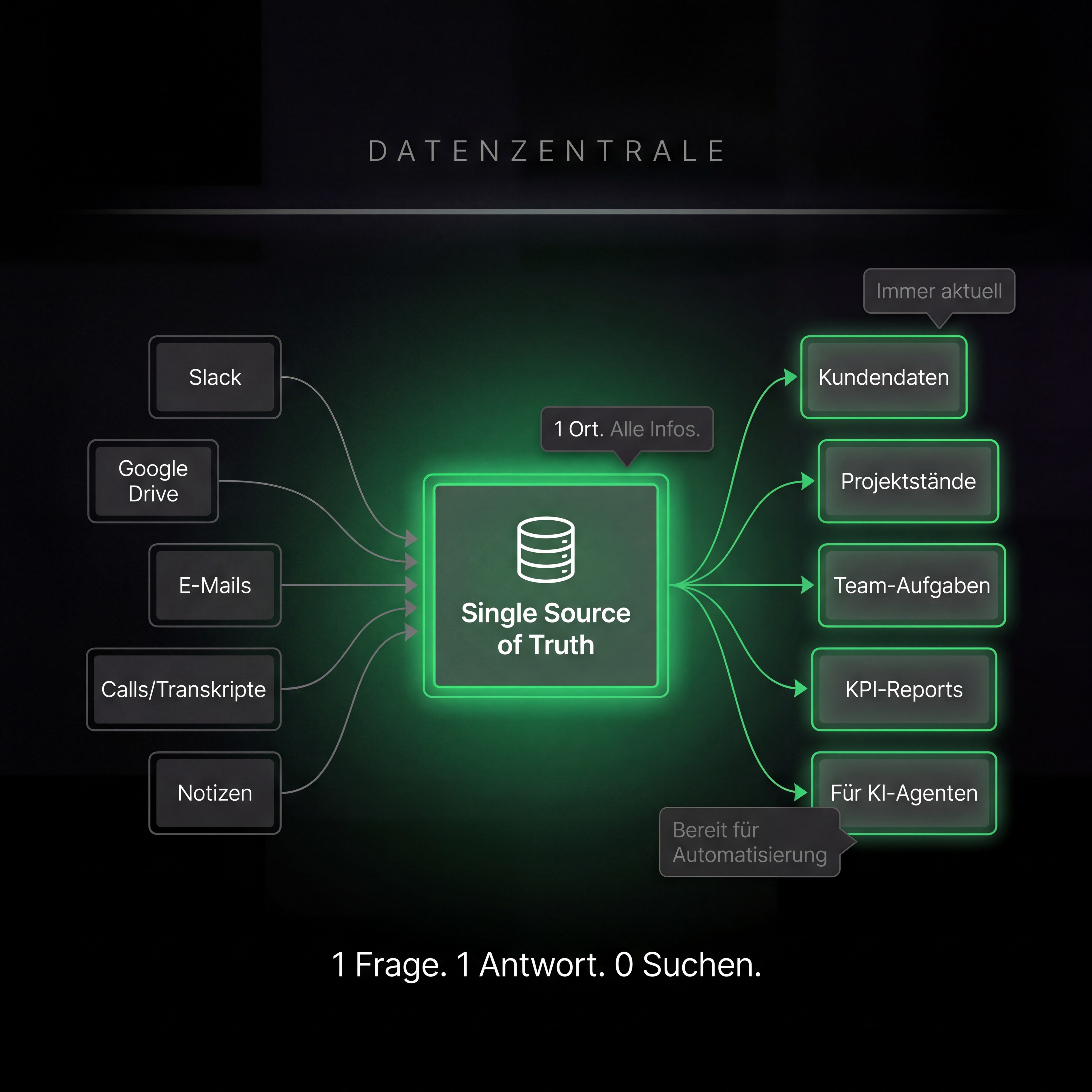 Eine Quelle der Wahrheit. Alle Kundendaten, alle Projektstände, alle Infos – ein Ort. Die Grundlage dafür, dass KI-Agenten überhaupt arbeiten können.
