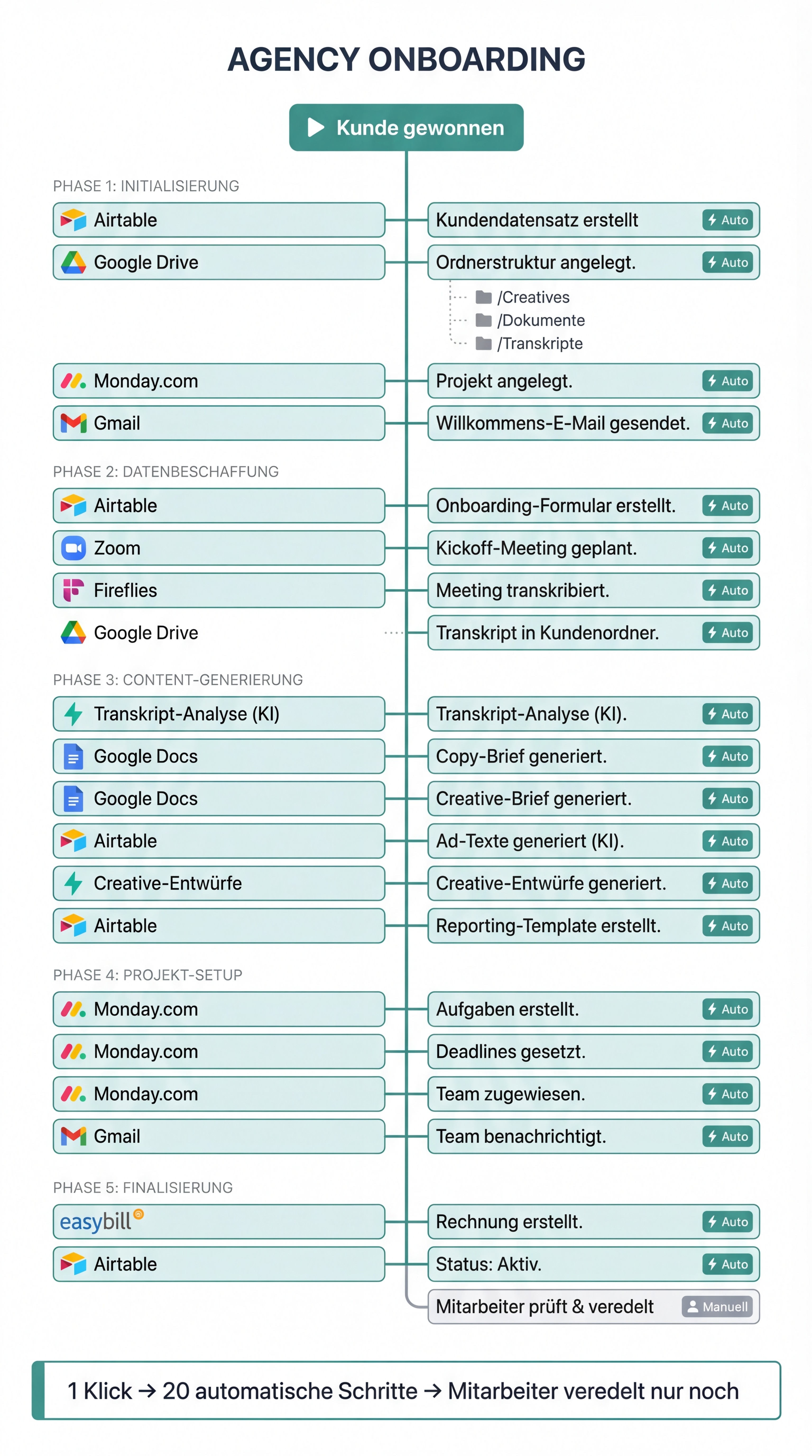 Monday. Airtable. Fireflies. Das neue AI-Tool, das gerade alle reposten. Jedes Mal denkst du: Jetzt wird alles besser. Wird es nicht. Ein neues Tool auf einem kaputten System repariert nichts. Du hast 7 Tools. Keins redet mit dem anderen. Du zahlst für alle. Nutzt keins richtig.