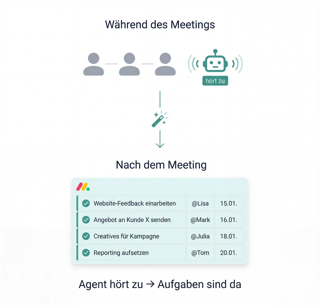 Call vorbei. Der Agent zieht To-dos aus dem Transkript, erstellt Aufgaben, weist sie zu. Dein Team arbeitet weiter, wo das Gespräch aufgehört hat. Nichts fällt durch. Nichts wird vergessen. Ohne dass du irgendwas machst.
